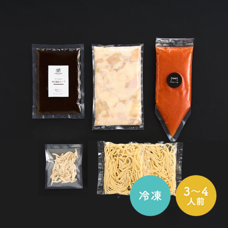 国内流通している99%が大量生産の中、原料から製造工程すべて手作業にこだわる国内でも数少ない1%の"明太子"ブランド「MENTIE」と、国産牛小腸100%の上質な"もつ"を自宅でも失敗せず美味しく調理できるよう、独自の下処理を施し、上品な秘伝出汁の醤油"スープ"と風味豊かな九州産の"ごぼう”、〆はコシのある長崎県の特製”ちゃんぽん麺”が楽しめる、「TAKUNABE」の”もつ鍋”とのコラボ鍋。