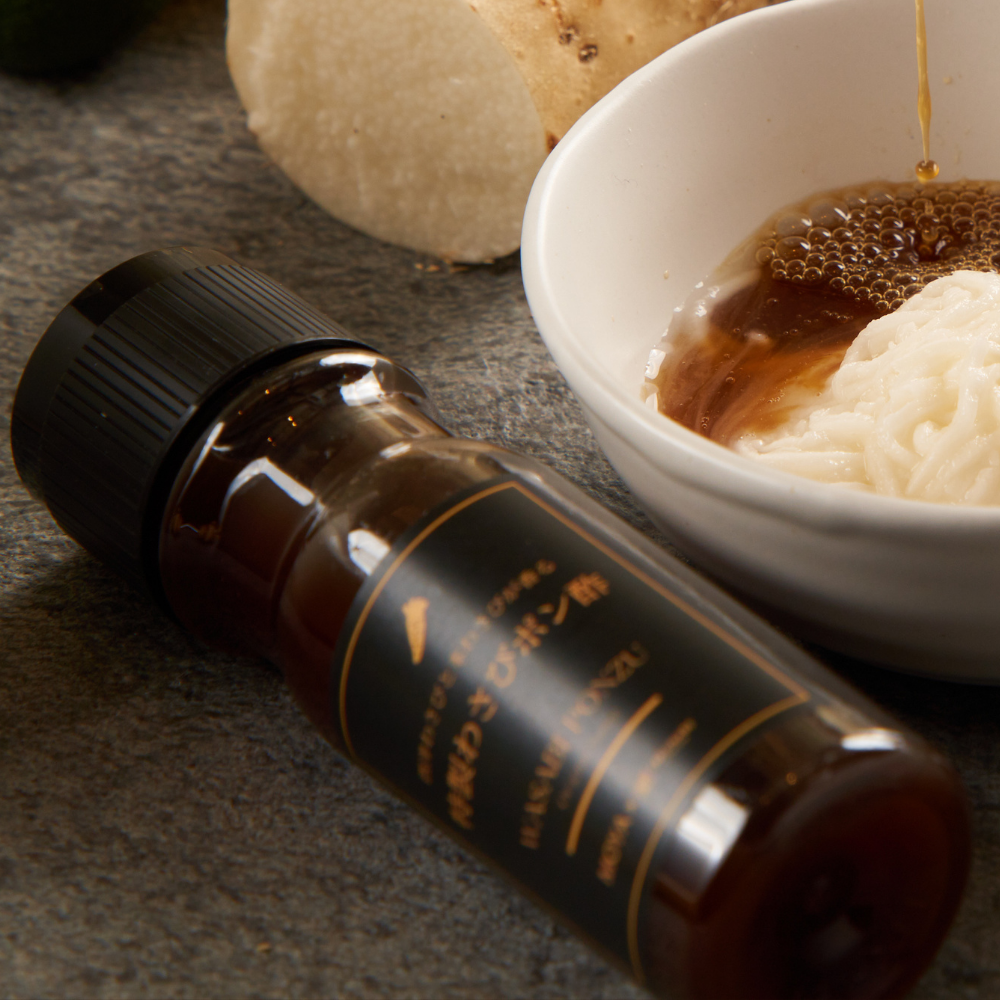 焼津産花鰹と利尻昆布の一番だしを加え、柑橘果汁とゆずの香りをほんのり利かせたまろやかでコクのあるポン酢に、おろしたての西洋わさびと本わさびをブレンドした、ツンとしすぎない爽やかな香りと辛味が絶妙なバランスの特製ポン酢です。
